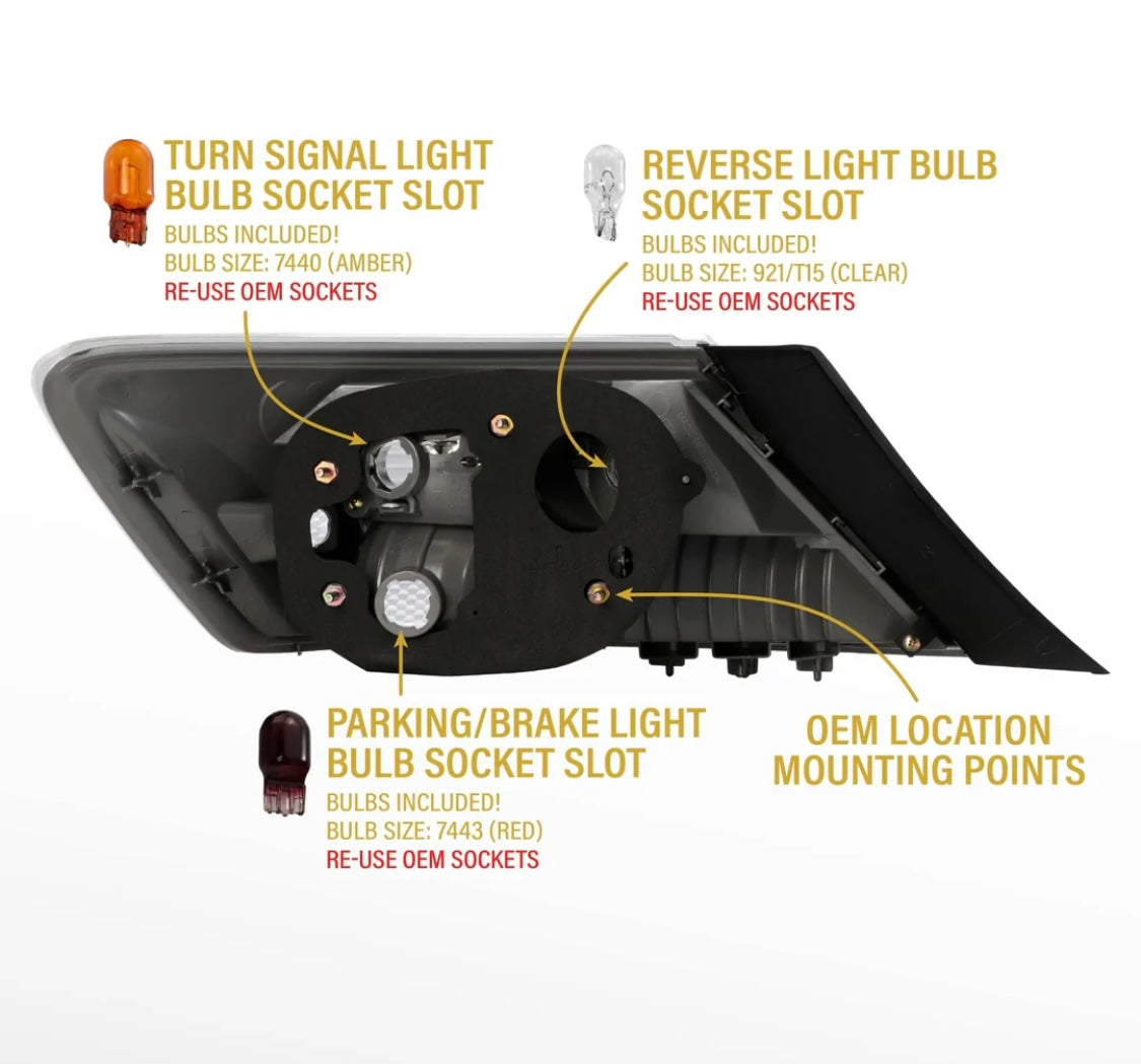 • Bulb Specifications: Red 7443 Parking/Brake Light, Clear 921/T15 Reverse Light, Turn Signal Light