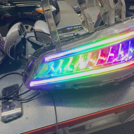 Features: Fully modified headlight lighting... Full RGB LED with daytime running lights in the center housing + 6500k daytime running lights (DRL) with 200 color modes, all with sequential turn signals. Warranty: We offer a 6-month warranty, starting from the shipping date, ONLY for the LED components and paint, if applicable, of the headlights we have modified. We are NOT responsible for installer negligence. (We will be able to detect if an error has been made.) Professional installation is recommended, as basic 12V knowledge is required. Due to the custom nature of these headlights or taillights, we do not offer returns or refunds. Any defective components will be replaced within the warranty period.