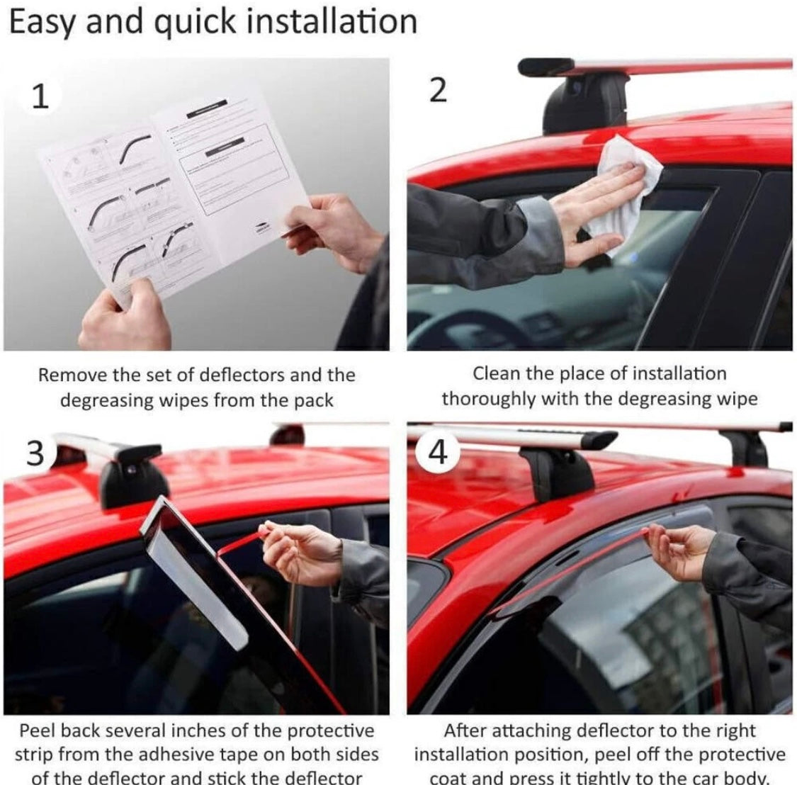 - Package includes: 2 pcs window visor deflectors (2 front), 2 pcs window visor deflectors (2 middle), 2 pcs window visor deflectors (2 rear), prep pad, manual instruction;